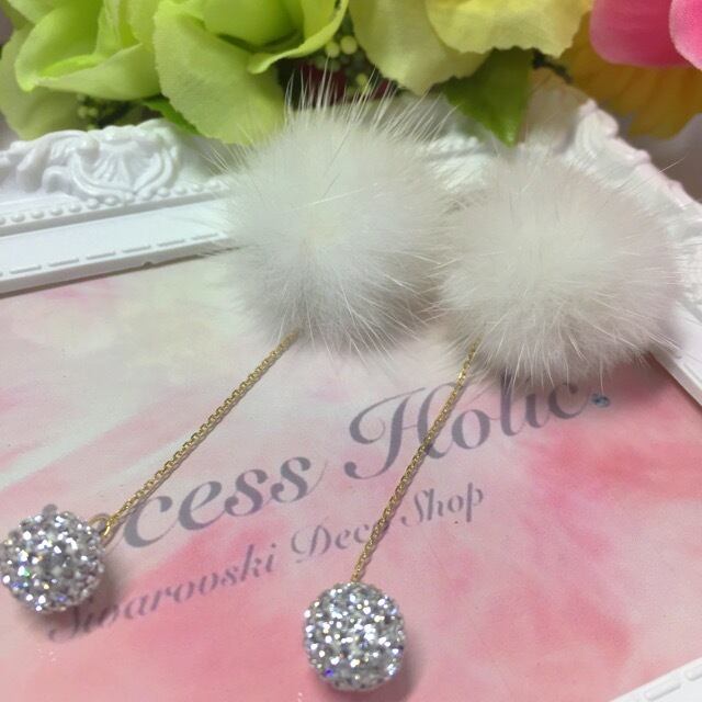 スワロボールの揺れるラビットファーのイヤリング