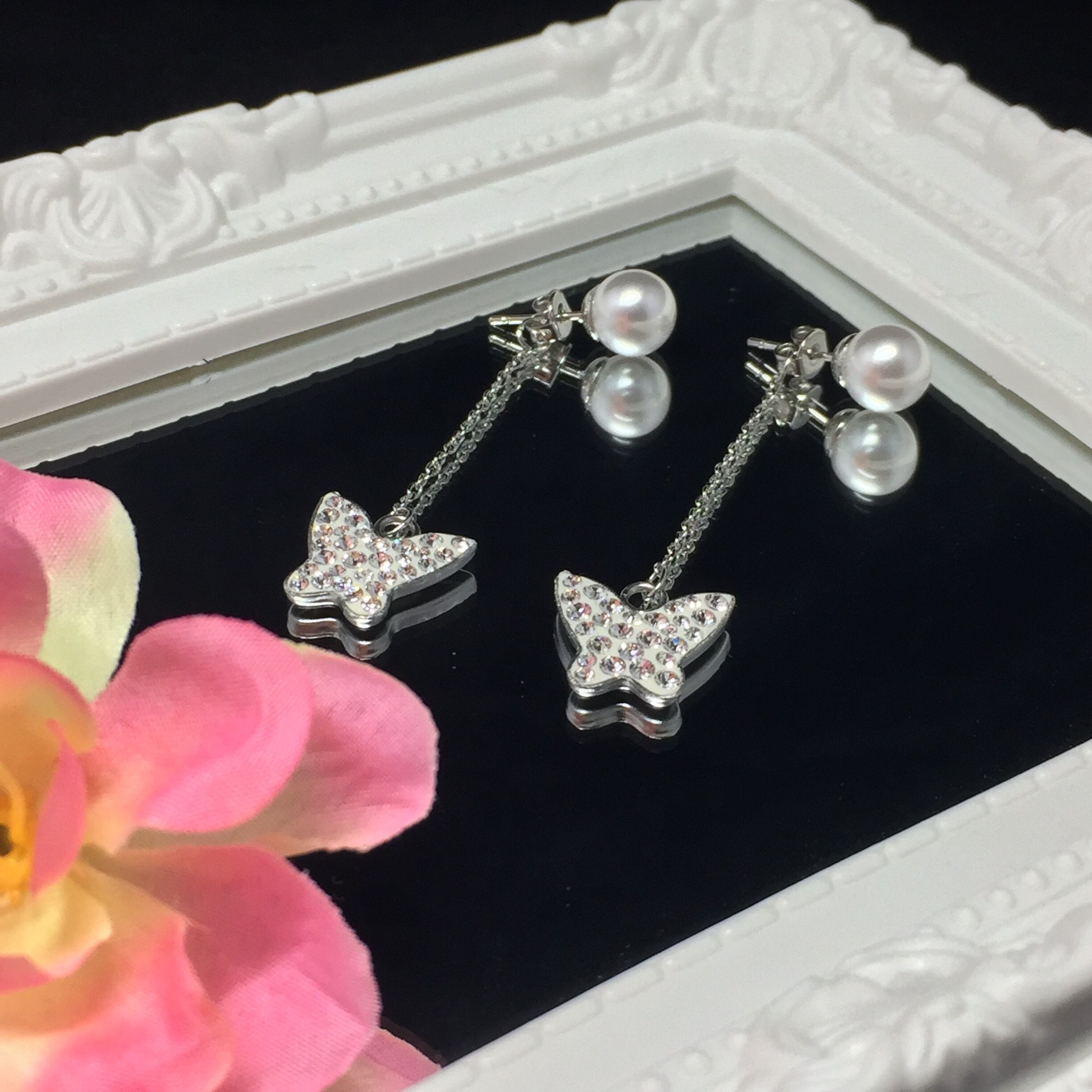 繊細な蝶々モチーフが揺れ動き、耳元で華やかな印象を与えます。パールが添えられていることで、さらなる上品さを演出。